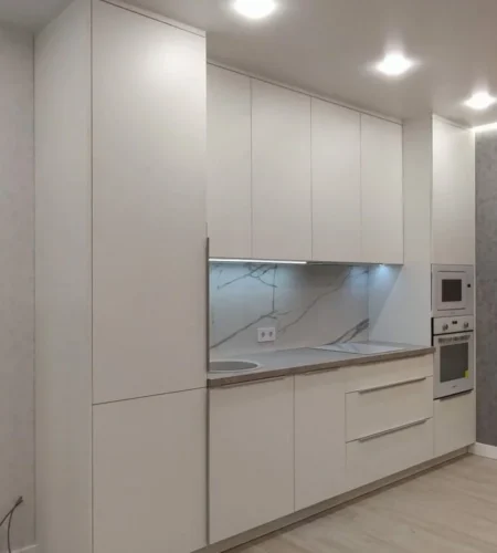 Современные минималистичные решения с глянцевыми поверхностями и скрытой фурнитурой.